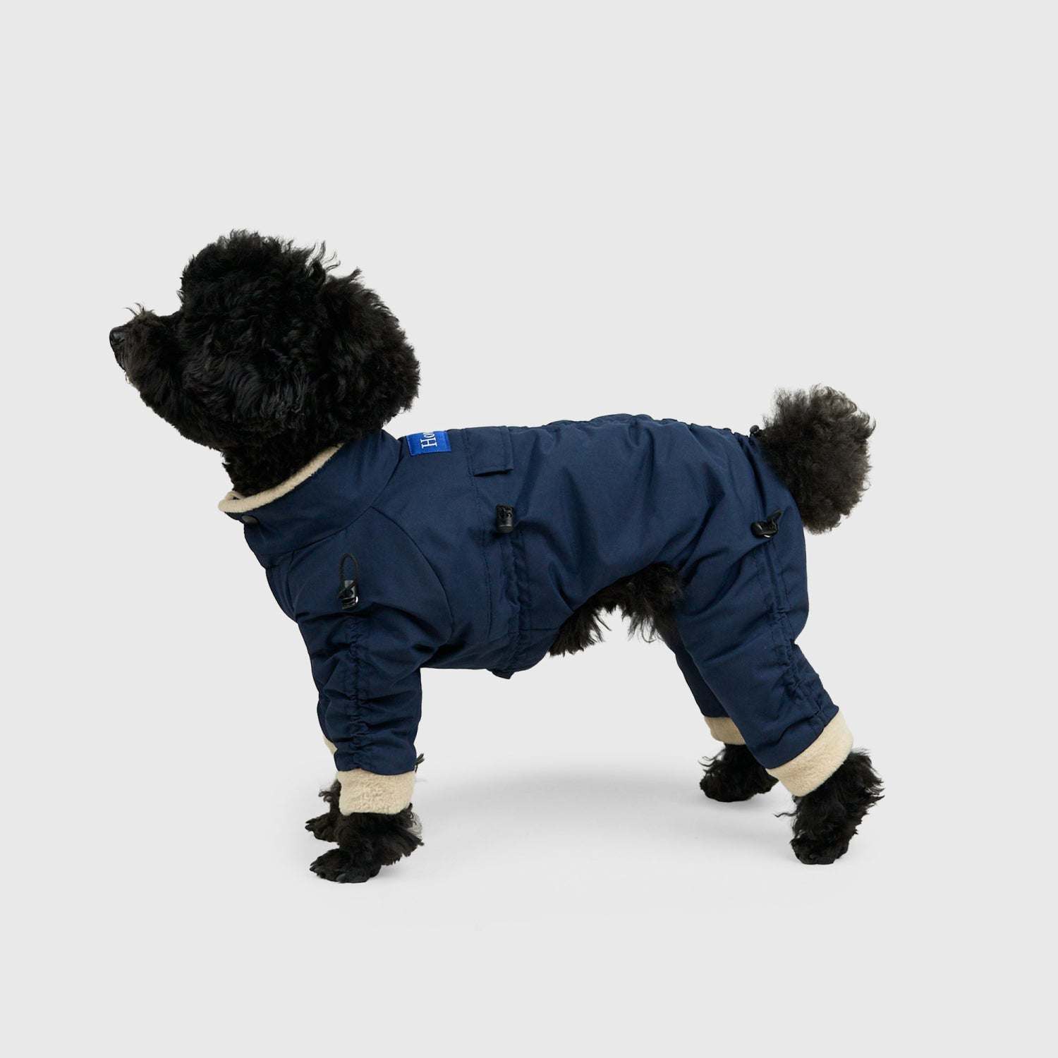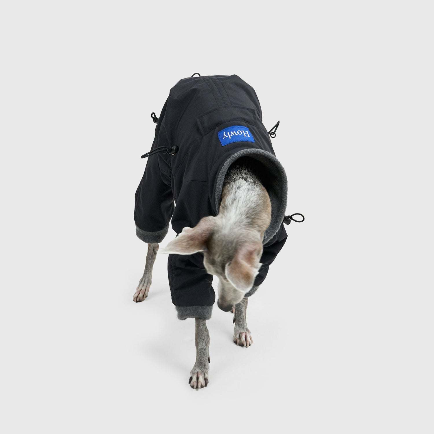 着丈・袖丈(4カ所)・胴回りの7カ所をドローコードでサイズの微調整ができ、体型の個性やインナーの厚みに合わせて密着度を最適化。体温で温まった空気層を保持しやすく、胴回りを整えることでおしっこ汚れのリスクも軽減します。立体設計のスーツ型シルエットが可動域を確保し、動きの多い散歩でもストレスを最小限に。