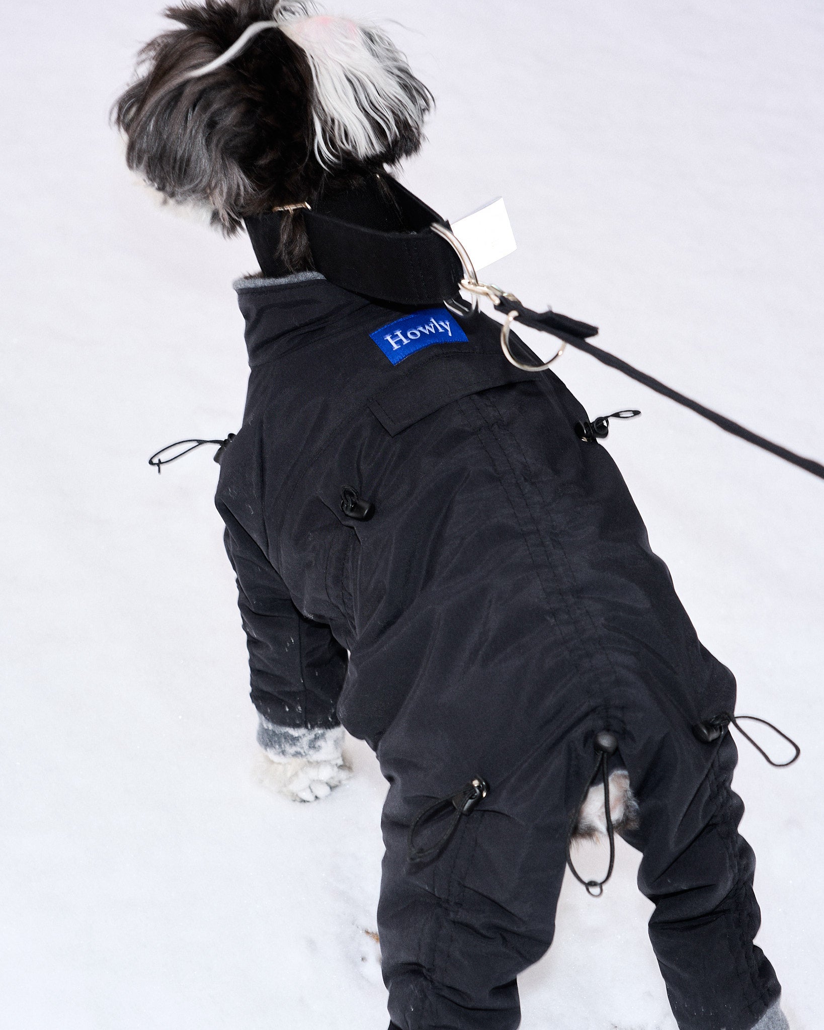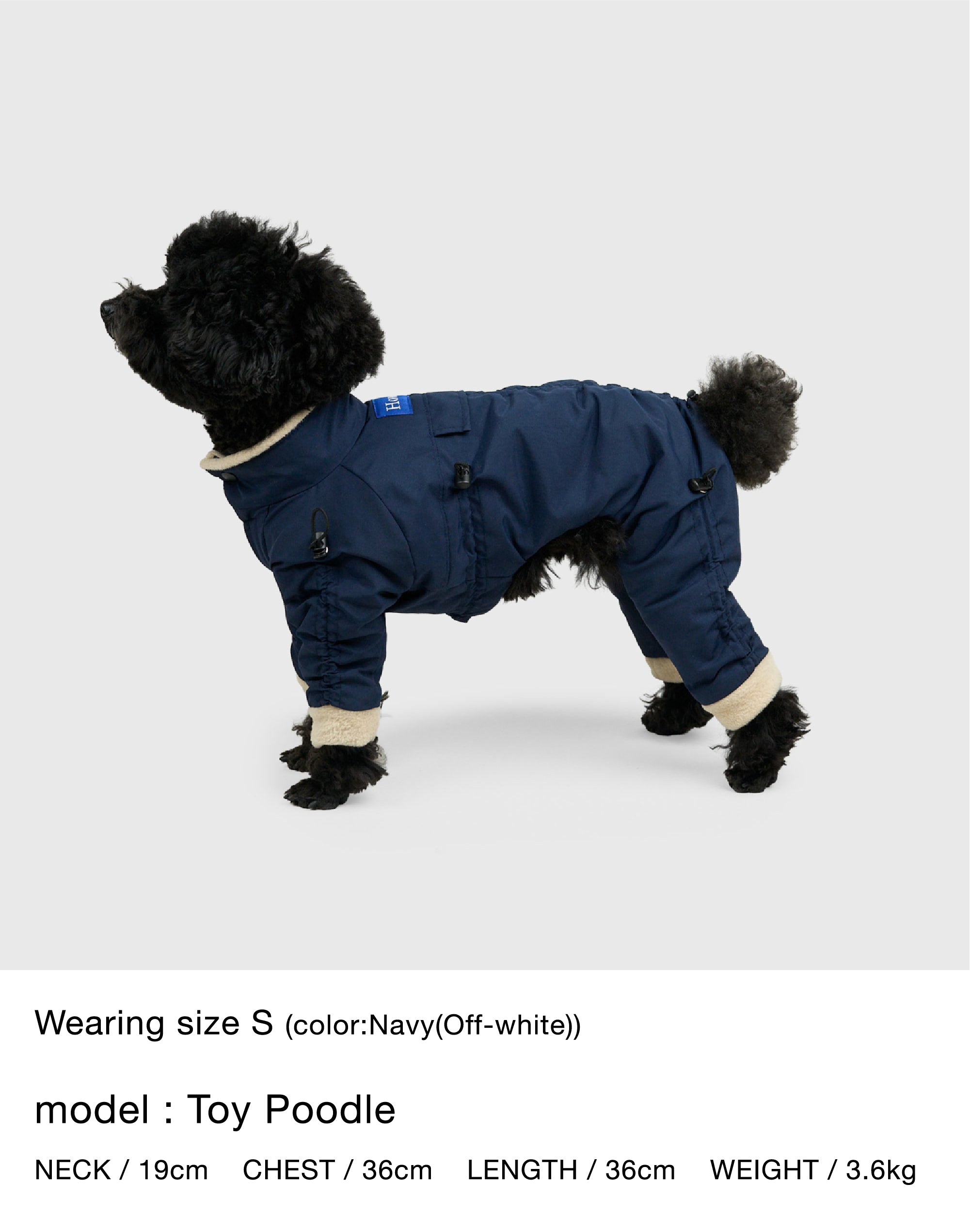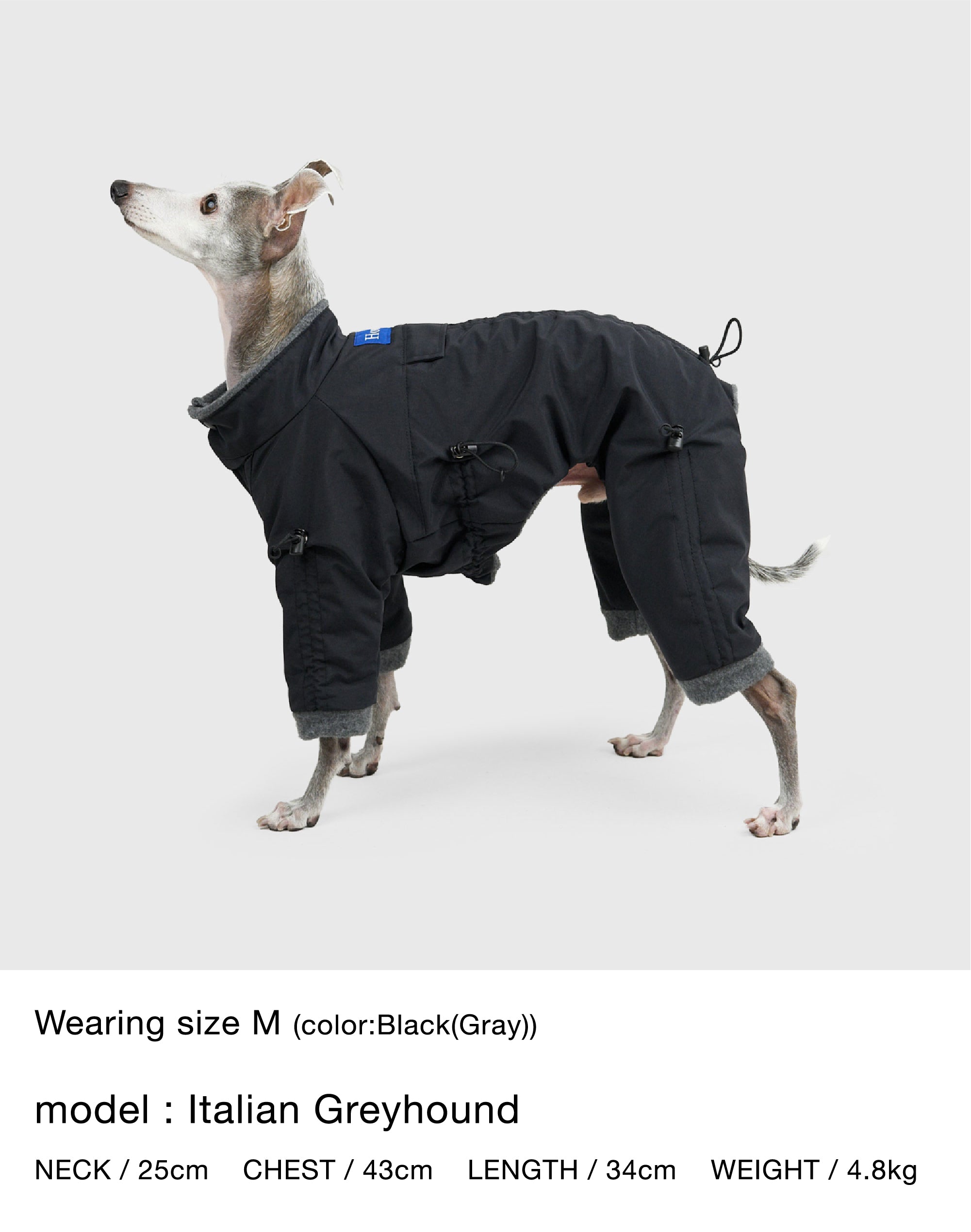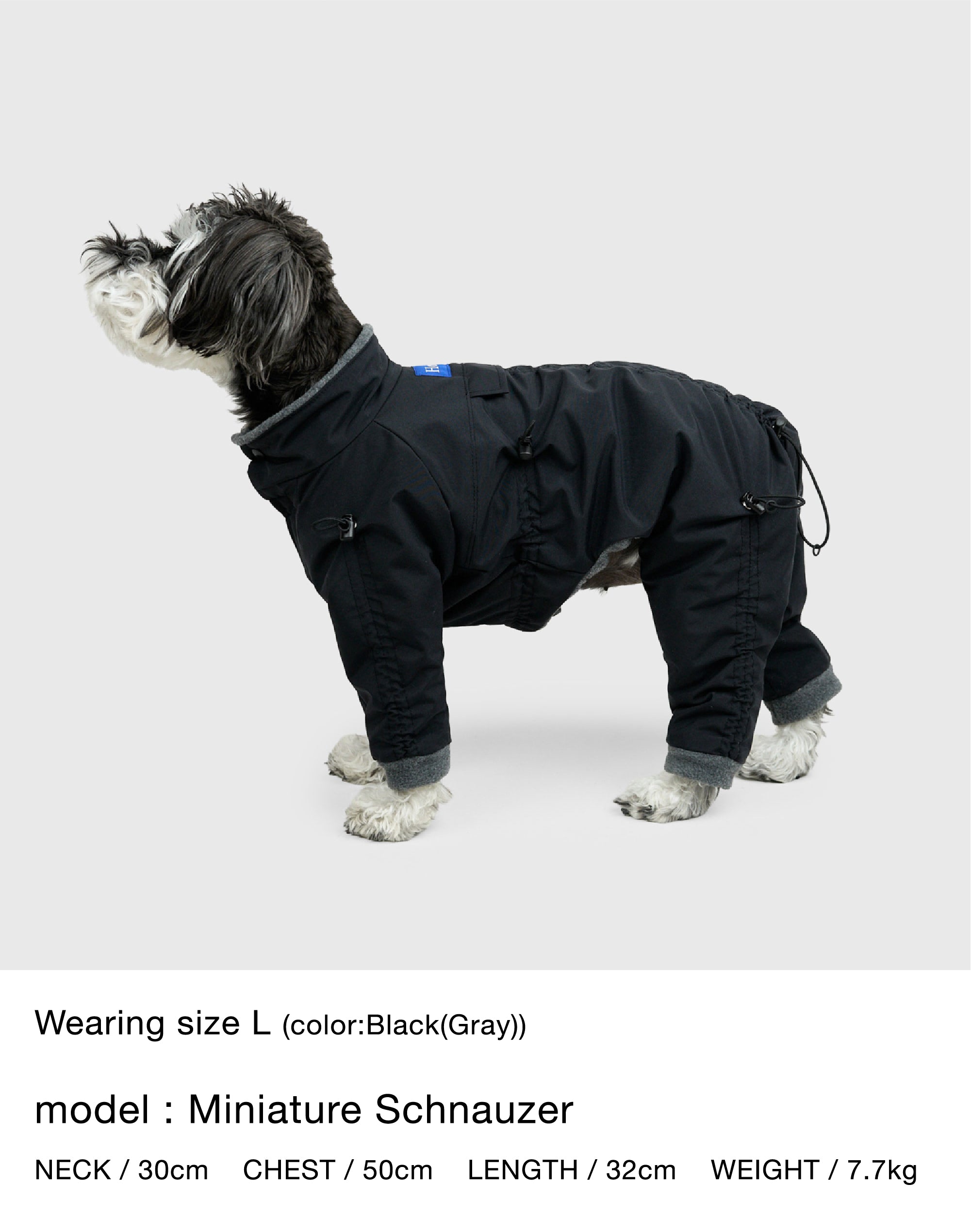 着丈・袖丈(4カ所)・胴回りの7カ所をドローコードでサイズの微調整ができ、体型の個性やインナーの厚みに合わせて密着度を最適化。体温で温まった空気層を保持しやすく、胴回りを整えることでおしっこ汚れのリスクも軽減します。立体設計のスーツ型シルエットが可動域を確保し、動きの多い散歩でもストレスを最小限に。