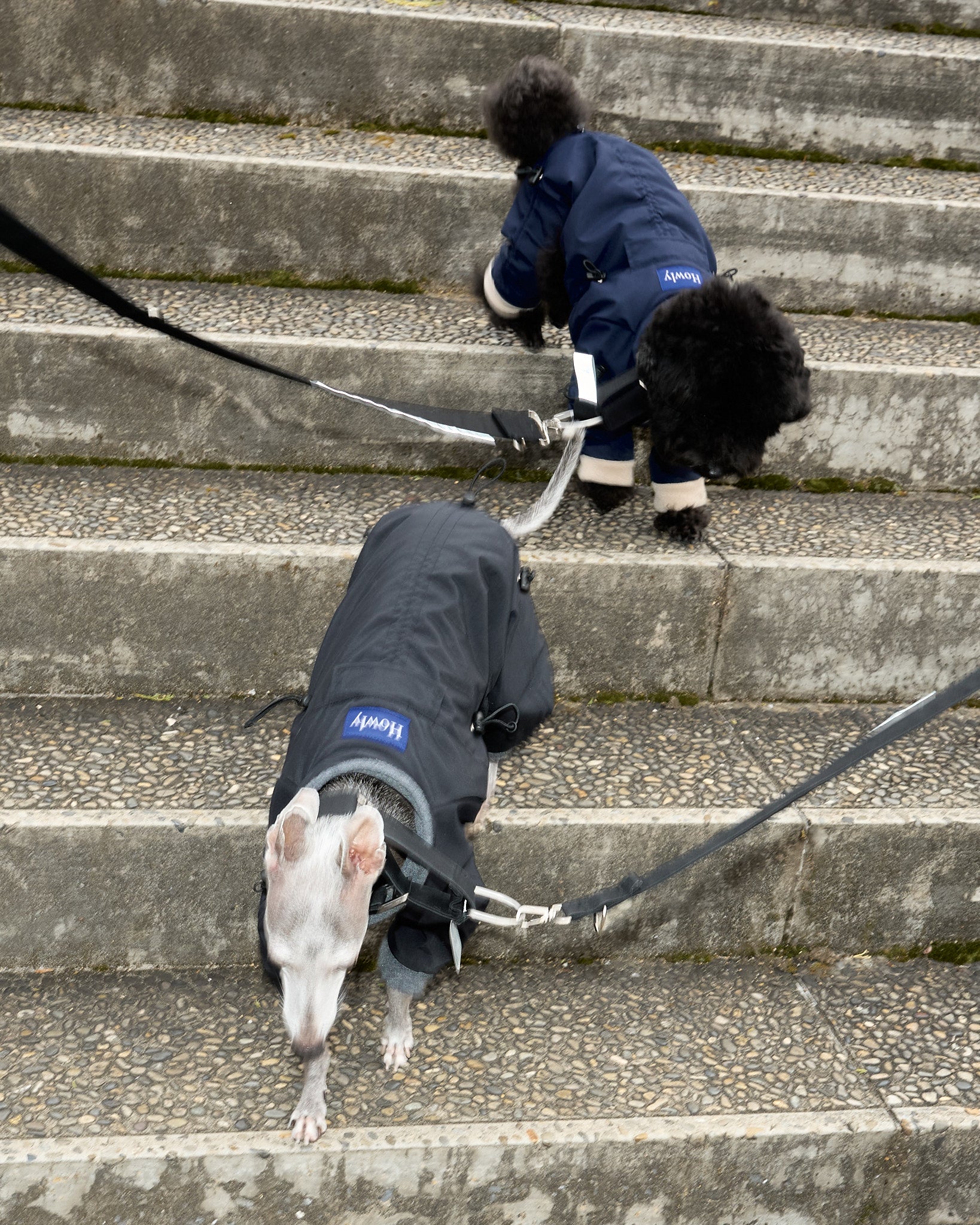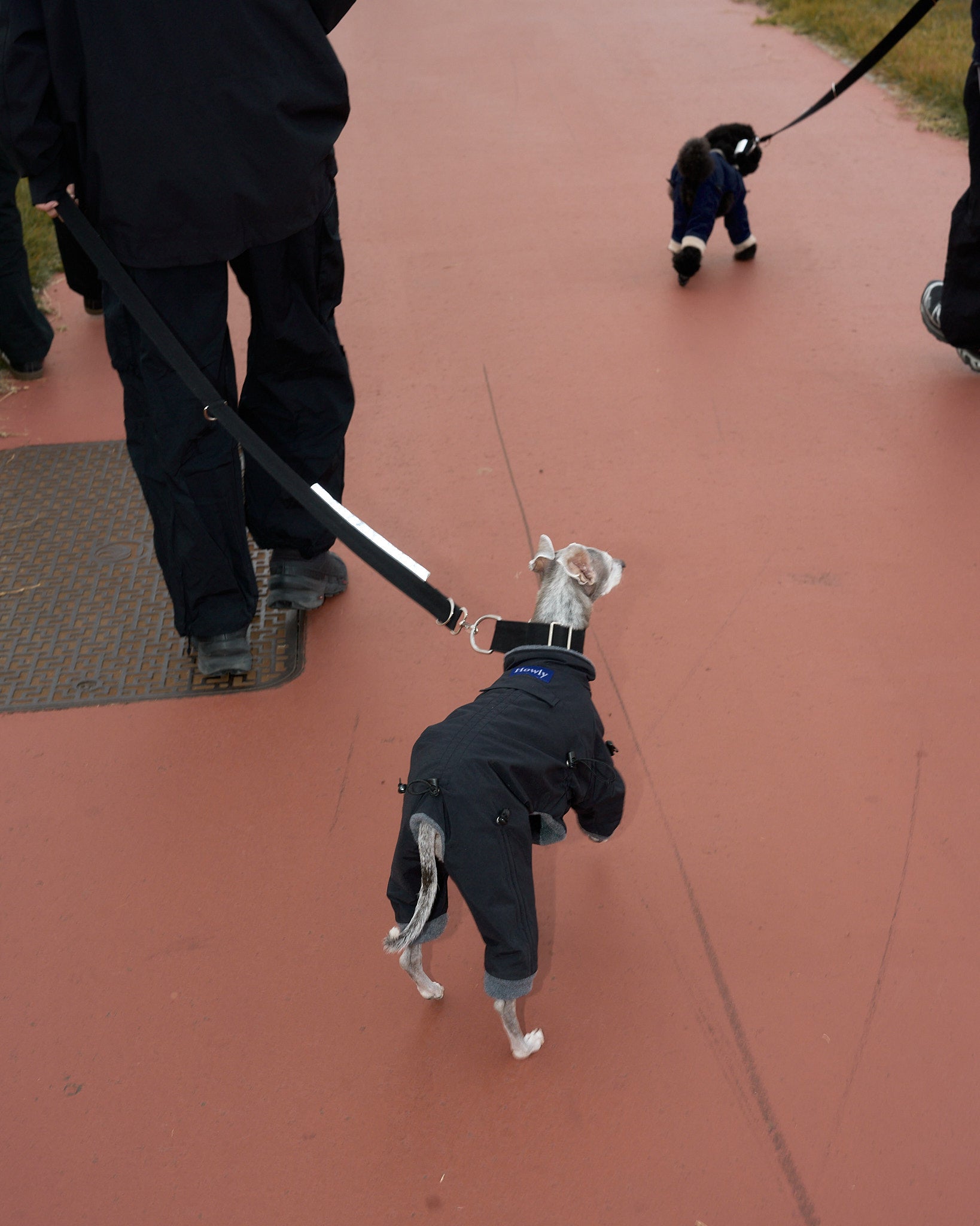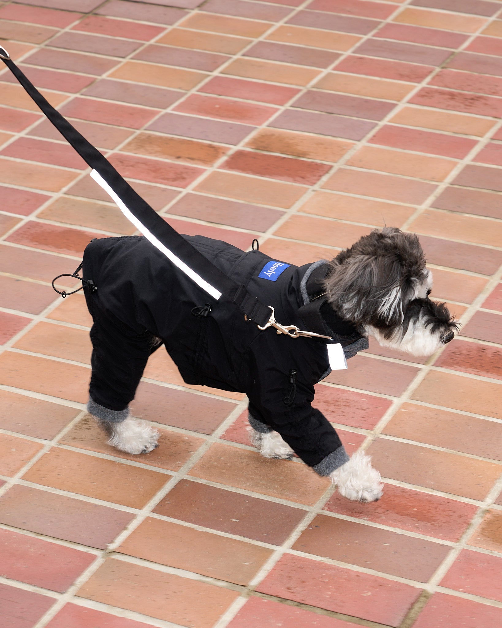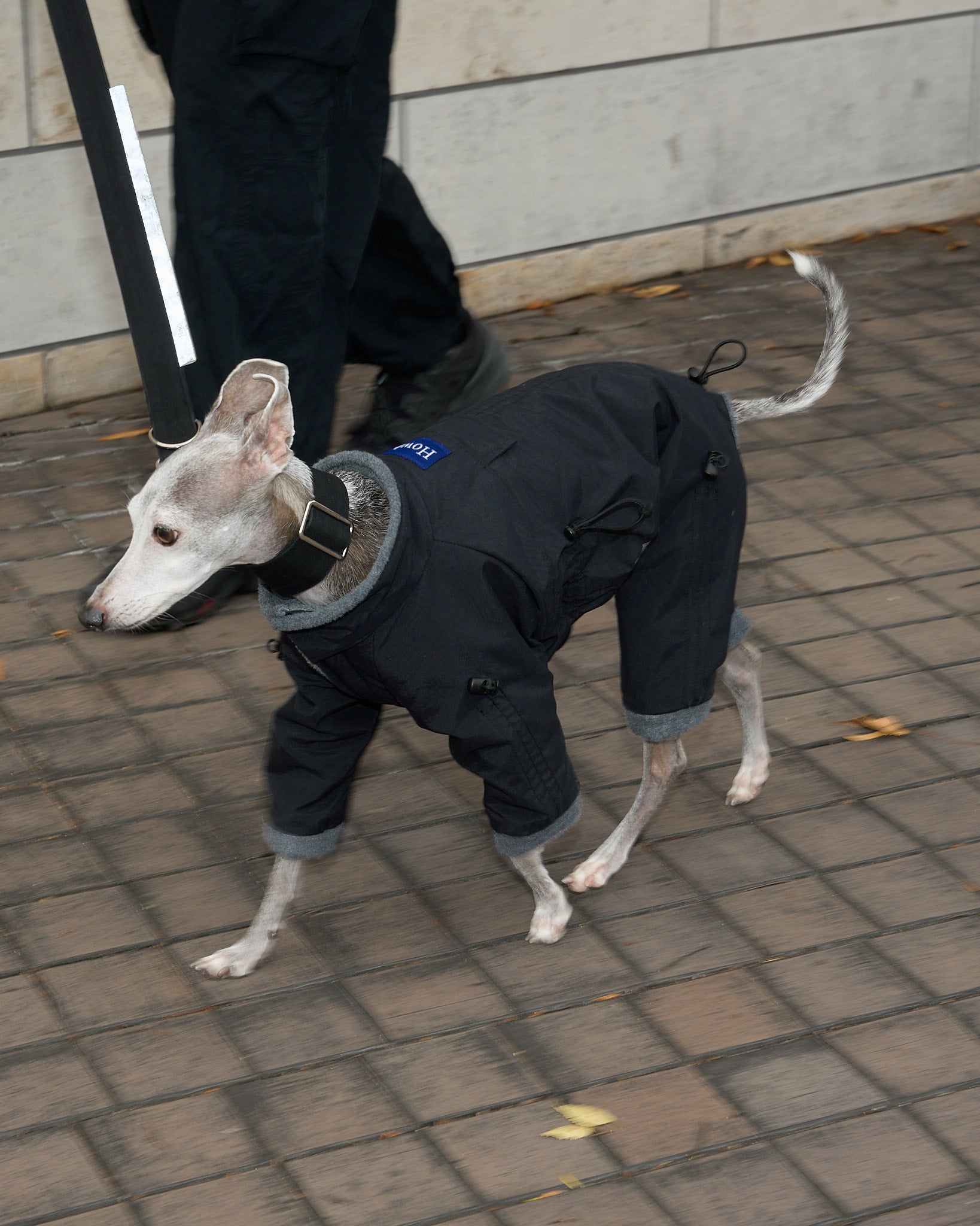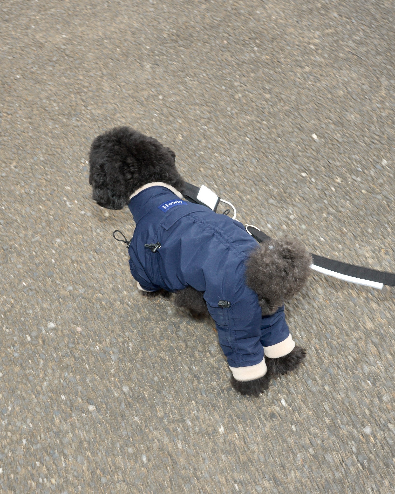 着丈・袖丈(4カ所)・胴回りの7カ所をドローコードでサイズの微調整ができ、体型の個性やインナーの厚みに合わせて密着度を最適化。体温で温まった空気層を保持しやすく、胴回りを整えることでおしっこ汚れのリスクも軽減します。立体設計のスーツ型シルエットが可動域を確保し、動きの多い散歩でもストレスを最小限に。