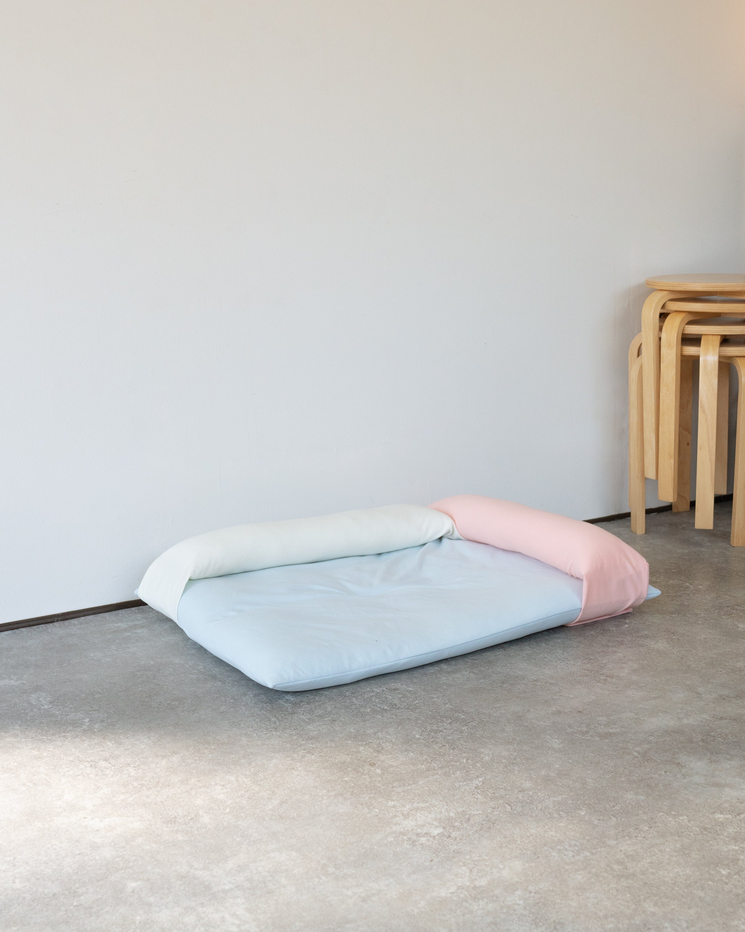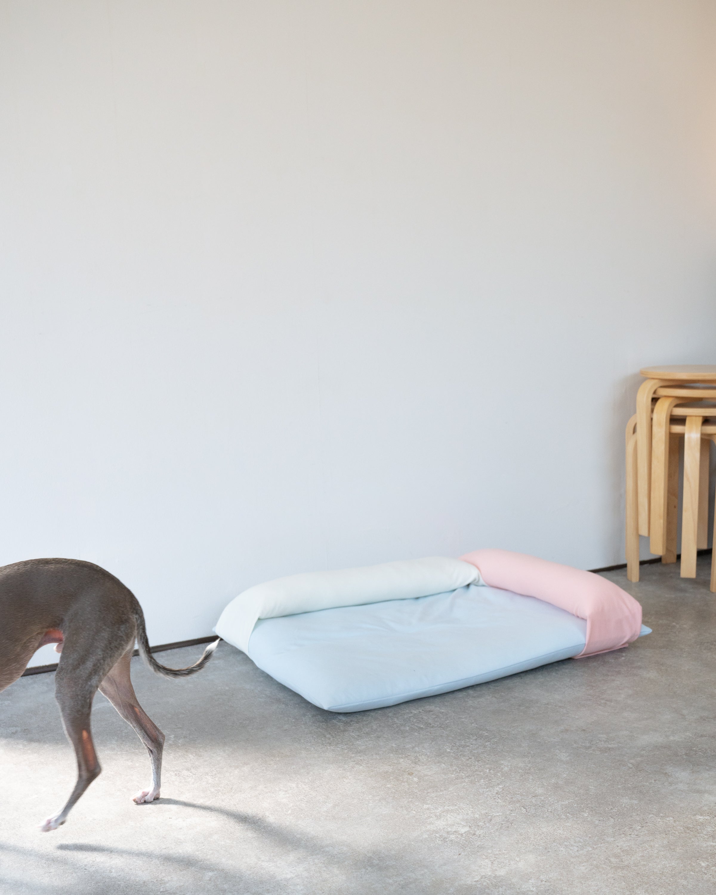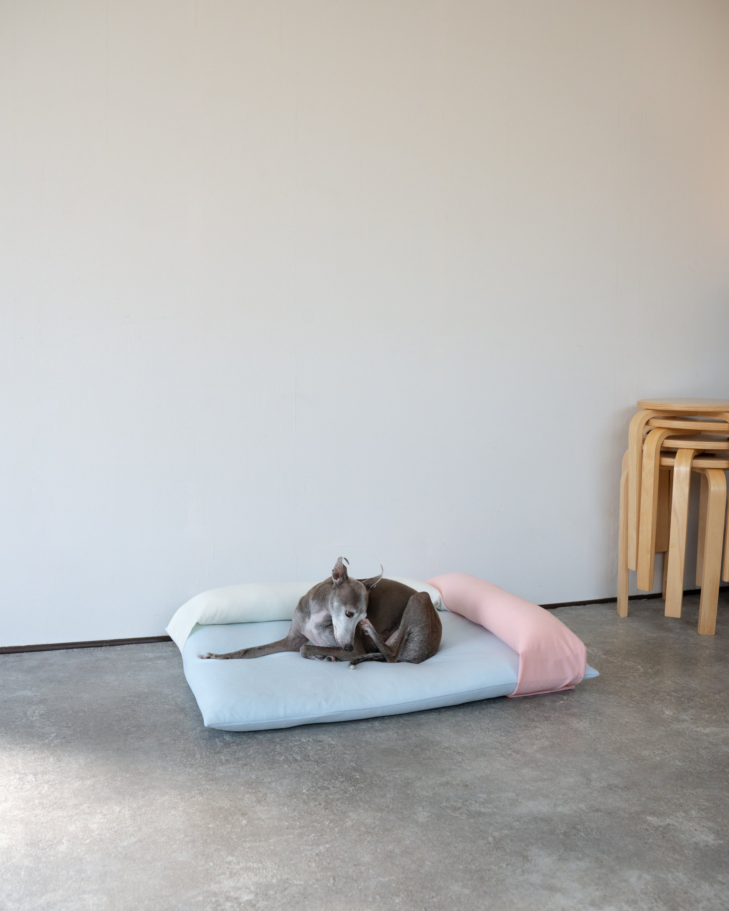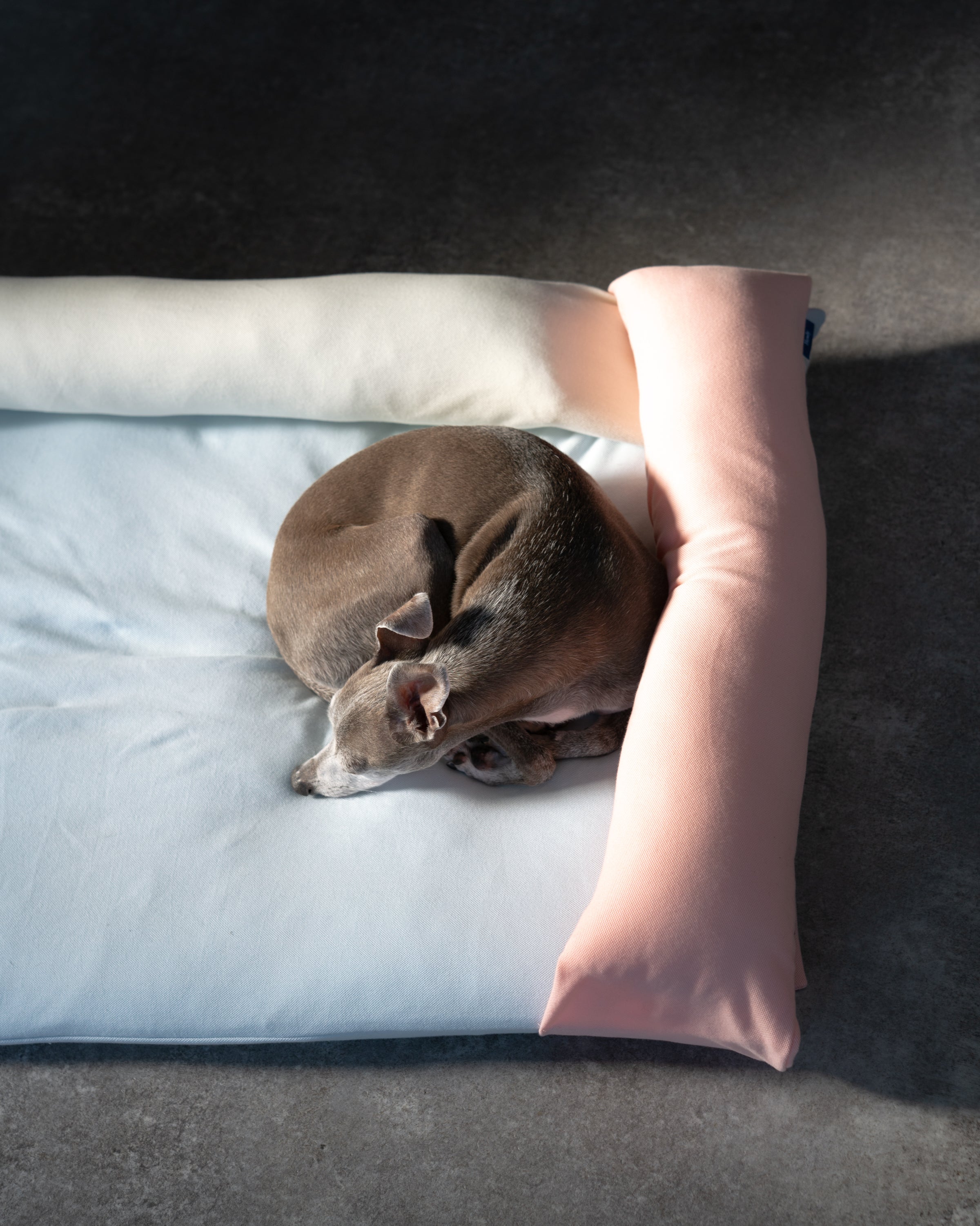 ベースとピローの5色カラーリングや設置方法でさまざまな表情を見せるドッグベッド。