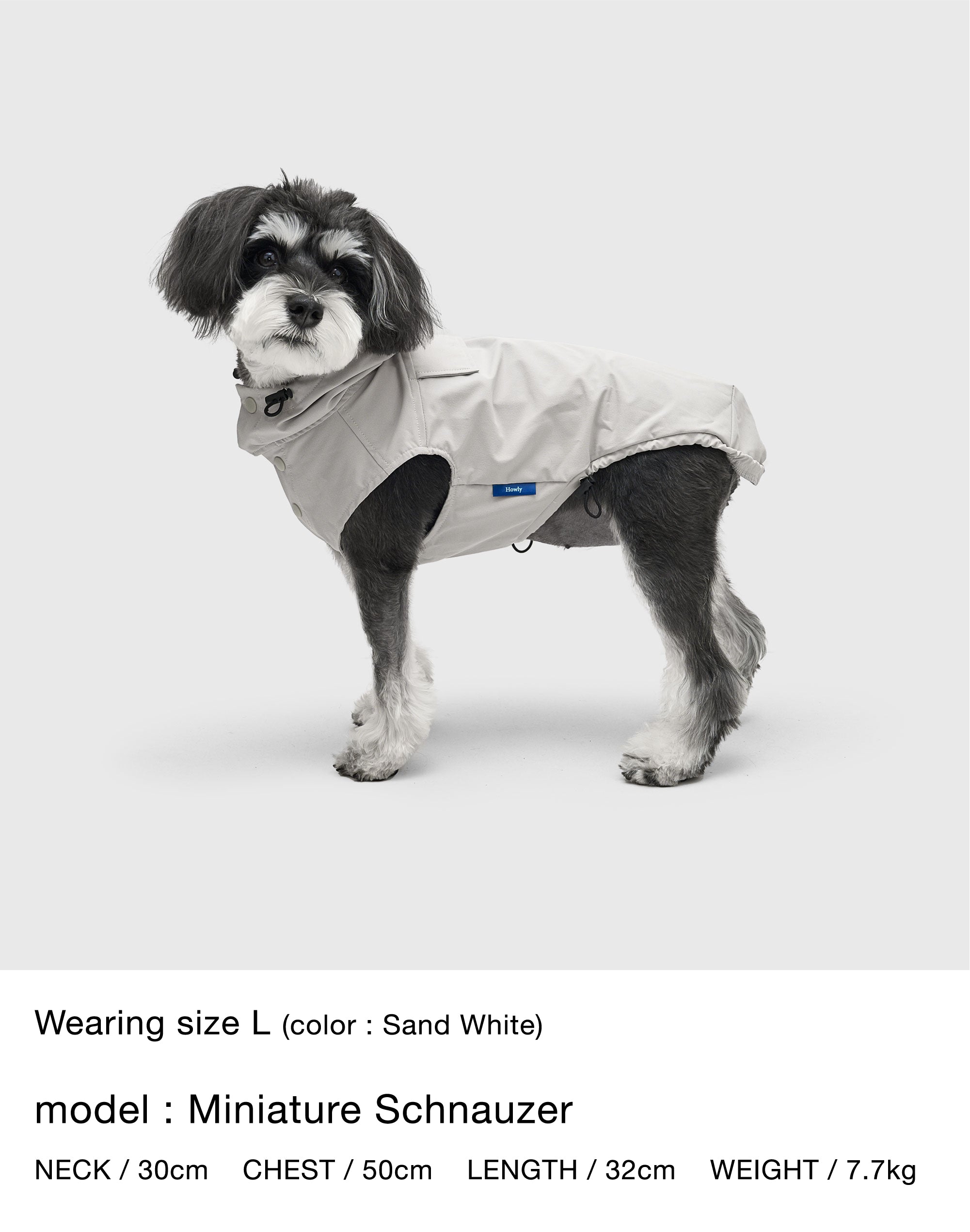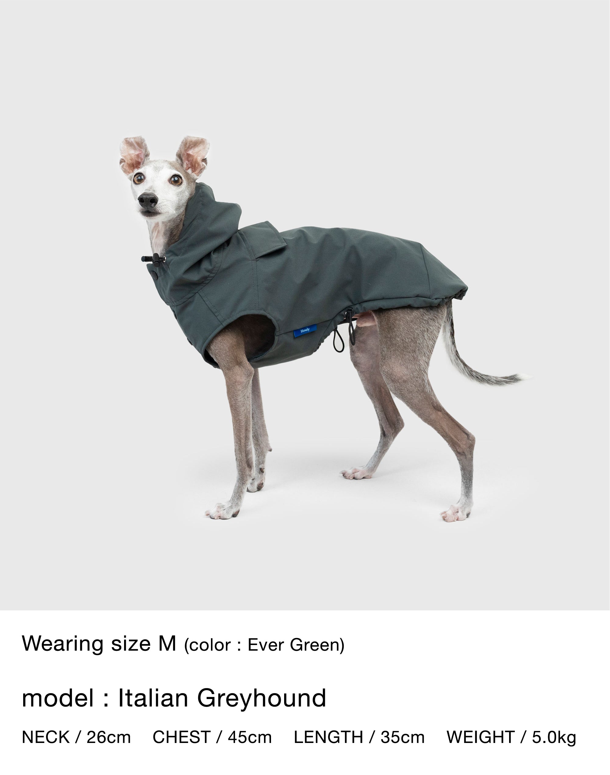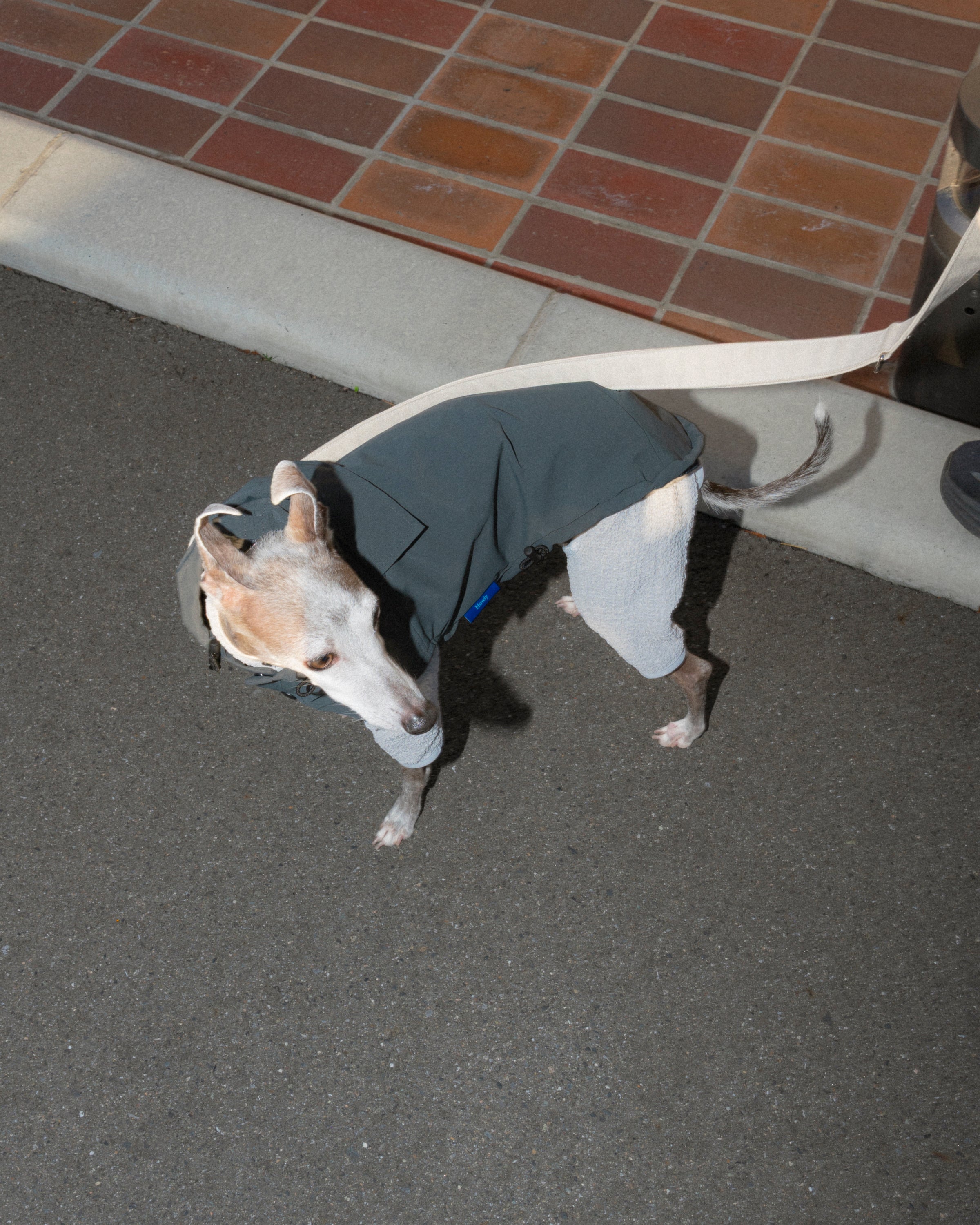 撥水性とアンチピリングに優れたポリエステル素材は、急な雨や強い日差しにも対応しながら、コットンのように柔らかい肌触りと適度なストレッチ性を兼ね備えています。オーバーサイズに設計している為、お尻までしっかりカバーして愛犬を守ります。また、ダーツ入りの立体構造とフードと裾に配したスピンドルで体へフィット性を高め、快適さを維持します。