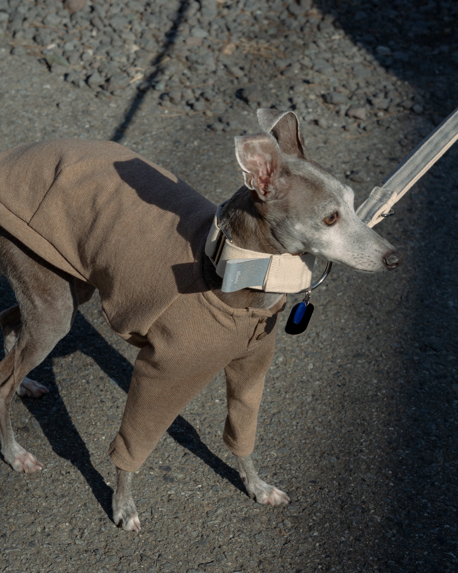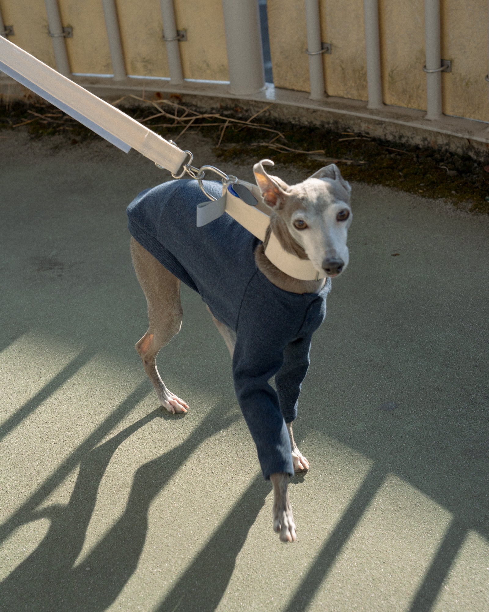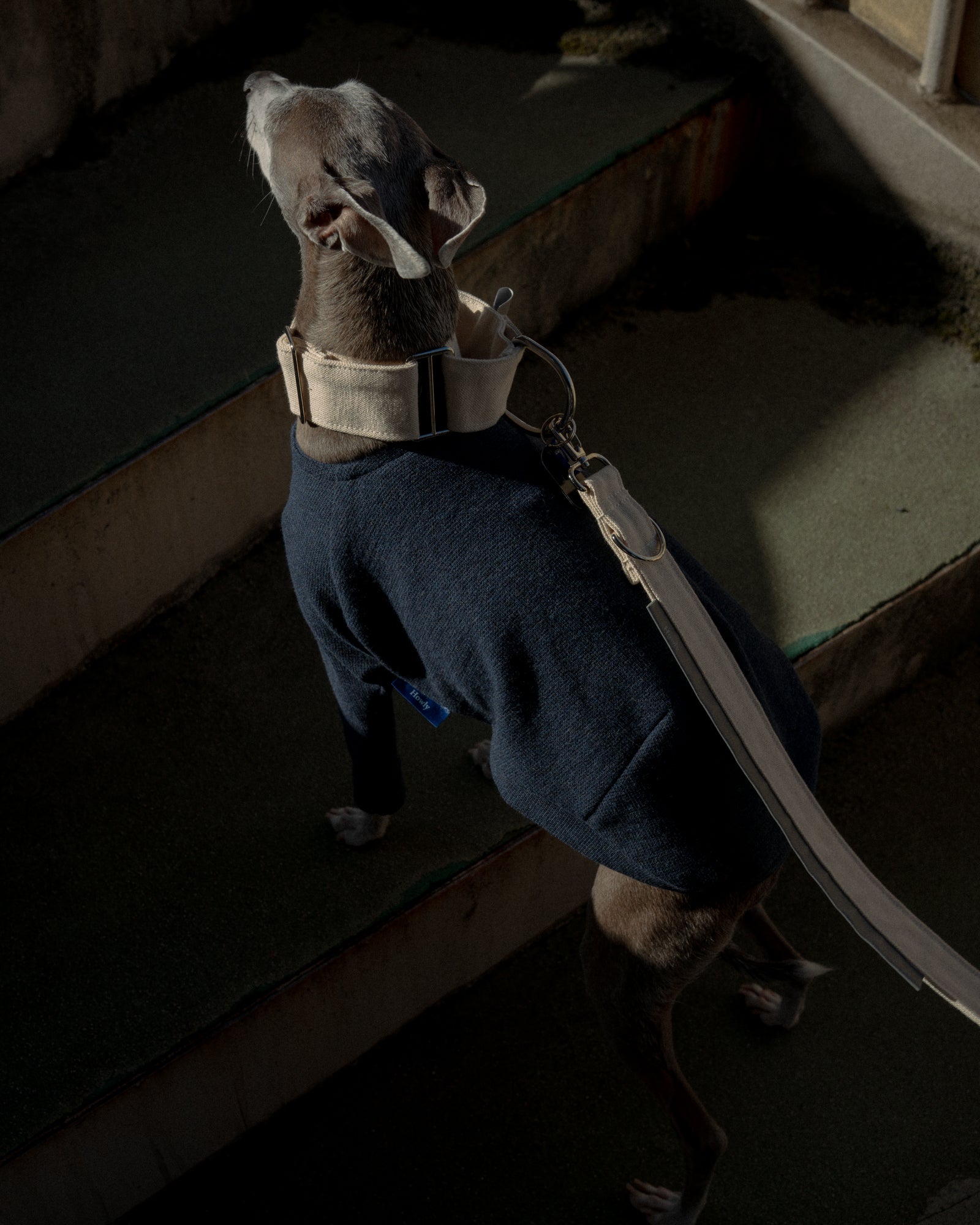 全ての季節で心地よく着用できるトップスを。SURFKNIT HENRYNECK TOPでは、BD糸(オープンエンド精紡機を用いた糸)を使用し、微表面変化のある組織で編み上げたサーフニット素材を採用しました。これによりさらっとした着心地とワッフル生地のような独特な目面を持つ美しいトップスに仕上がりました。首元はヘンリーネックを採用し、愛犬の着用感を向上しつつも、視覚的にも美しい細やかなディティールとなっています。前身頃にはゴムを入れ、胸回りのフィット感も作り出しています。ボディへダーツを入れることでハウンド犬の美しい体の曲線や細さに合わせた設計になっています。